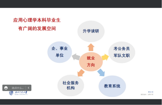 的发展历史,同时描述了西南交大应用心理学培养的两大特色,即心理学与健康学相结合与心理学与交通工程结合。最后,柯书记就学生和家长最为关心的就业问题进行了交流,明确表示社会对应用心理学人才的需求日益增加,同时简要介绍了应用心理学人才的五大就业方向。