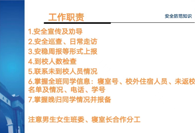 柯小君副书记特别强调了班级安全委员在学生安全保障角色中的重要性和工作特殊性,然后重点就交通安全、人身安全、财产安全、网络安全进行重点强调,通过诸多示例,向安全委员们讲述了其中危害,提出了防范措施建议和要求。柯老师要求各班安全委员要做到“安全三问”,一问是否将相应通知要求及时传达和提醒同学们,二问同学是否收到和反馈留痕,三问是否及时发现和上报隐患风险。最后就目前存在的学生安全工作形势进行了研判,柯老师要求各班仔细排查是否掌握班级同学的电瓶车拥有量和停放情况,是否有空床位转借情况,是否在每个寝室明显处张贴防火防盗安全提醒,是否仍有使用违章电器情况,是否每天按时统计晚归和夜不归宿情况,是否有同学上当受骗情况等。柯老师希望同学们要担负起安全委员的职责,高度重视学生安全工作,通过召开主题班会、在班级群里宣传提醒等多种方式加强安全教育,建立起学生安全检查提醒工作台账,为同学们学习成长成才建立起一道安全屏障。