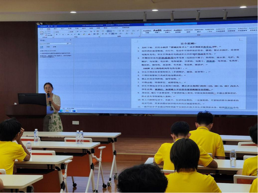 会议最后,樊老师特别强调在校安全,例如防火、防盗、防落水等,讲解了住宿管理规定、本研请假制度等。在互动问答环节中,同学们进一步了解了什么是违章电器以及存放或使用之后导致的严重后果。