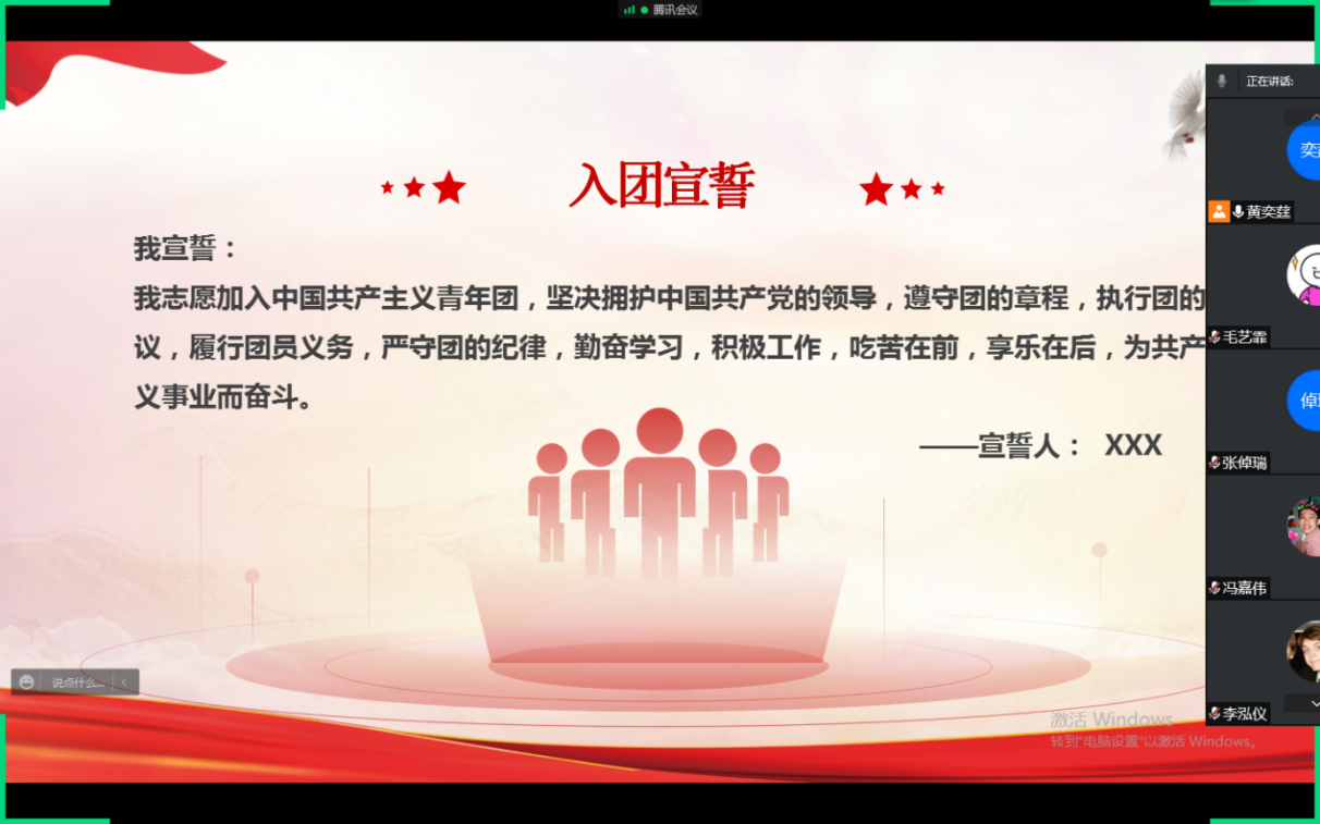各支部团支书负责主持,结合疫情时代下青年志愿者的分享,重温五四精神,同学们认识到作为新时代的青年学子在国家危急关头应摆正心态,做好自己,勇于担当时代使命,爱祖国和人民。全体同学重温入团誓词,重温当年志愿加入共产主义青年团的决心与信念。并且同学们一起学习了最新一期的青年大学习,了解了青年运动的光辉历程。最后同学们抒发了自己在学完专题学习后的感悟。