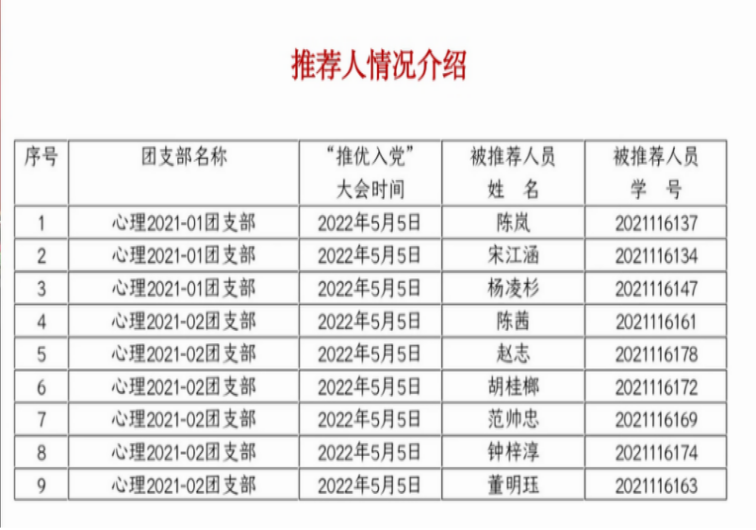 大会分为两项议程,第一项议程:应用心理学2021级01班团支部书记和2021级02班团支部书记分别介绍了推优入党的名单,并详细介绍了陈岚、宋江涵、杨凌杉等9位同志的思想和学习状况。