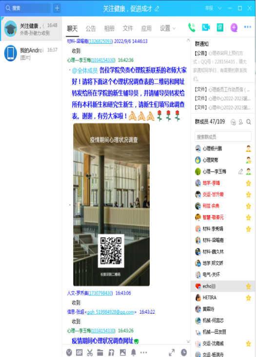 老师积极指导大学生心理学会、研究生心理学会等学生社团充分发挥朋辈作用,开展各种“健心”社团活动,共同抗击疫情,为守护同学们的心理健康保驾护航。