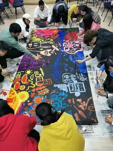 后两次的活动主题是绘画分享,成员们首先进行一次无交流的绘画,每人一罐颜料,共同在一张画纸上根据自己的想象进行绘画。