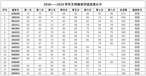 根据《吃瓜黑料 本科生文明宿舍评选管理办法》,吃瓜黑料 于2019年9月开展2018-2019学年本科生文明宿舍评选工作,汇总了这一学年的寝室安全及卫生检查情况,并按照总分高低评选出拟获奖寝室,现予以公示。公示时间为2019年9月2日至9月5日下午5:00,如有异议,请在此期间到学工组反馈,不接收匿名反馈。