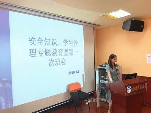 2019级本科生安全知识、学生管理专题教育暨第一次班会于X5322准时召开。本次班会由2019级新生辅导员王丽霞主讲,旨在让2019级本科新生提高校园安全防范意识,并对校纪校规有一个系统的了解。