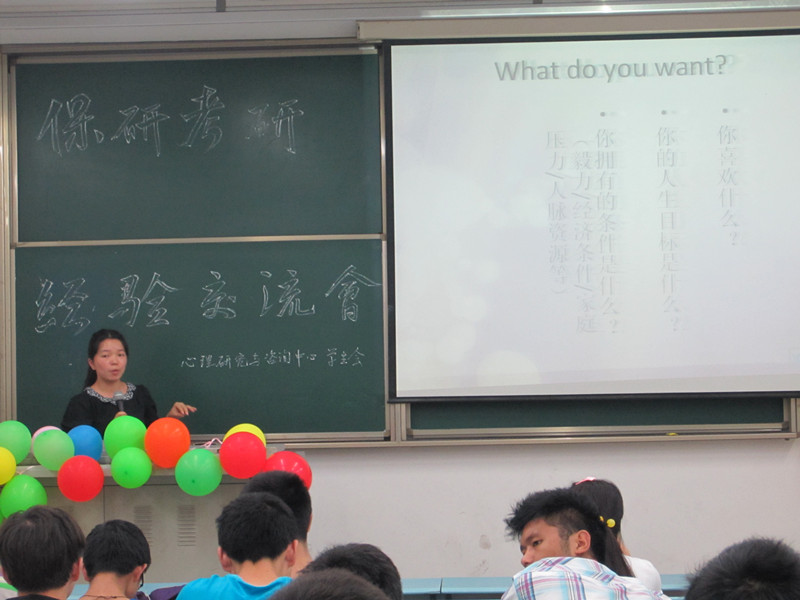第一位登上讲台的是被华中师范大学应用心理系录取的唐小娟学姐,在长达一个小时的演讲中,唐小娟以详尽的PPT结合自身经验向我们讲解了考研过程中所要面临的层层关卡以及该如何成功地突破这些难关,唐学姐认真负责的态度也感动了台下的师弟师妹们。
