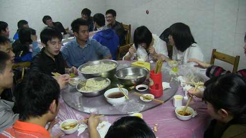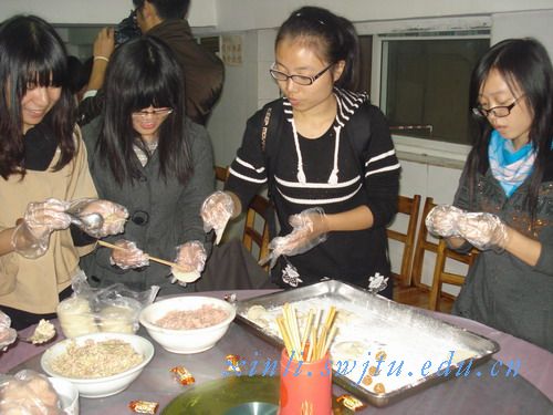 11月28号下午,同学们一同来到交大老彭餐厅的二楼,开始做着各种前期的准备工作。正所谓饺子好吃馅难调,不过还好这次的饺子馅是事先准备好的,同学们只是负责包的部分,要不然大家还真不知道该怎么下手。一开始,同学们被分成三组,分别在三个桌上进行,同学们个个都跃跃欲试,兴奋地心情溢于言表。饺子的皮和馅一上桌,此次活动的第一波高潮就开始了,各组成员你争我夺,恨不得立刻把材料给瓜分完。各组成员在拿到自己的材料之后,包饺子就正式开始了。虽然很少有同学专门学过怎样包饺子,但大家的表现还真不赖,那架势、那手法,还真不比专业人员差到哪去。当然,此时的一些同学也借机发挥自己的创新能力,把饺子包成各种形状,像飞碟、烧麦等等,使得其他人捧腹大笑。在传统包饺子的过程中,人们往往会在饺子里包进几个硬币,谁如果吃到硬币就预示着在今后一年里他会很有财运。此次活动同学们也遵循了这一程序,只是进行了稍稍的改变。大家会在包饺子的过程中,偶尔把几颗话梅包在饺子里,吃到话梅的人可以到班长那兑换硬币,当然,其中的意义都是一样的。此时大厅里的同学们就像一个真的大家庭一样,欢乐与和谐的氛围充斥了整个大厅。