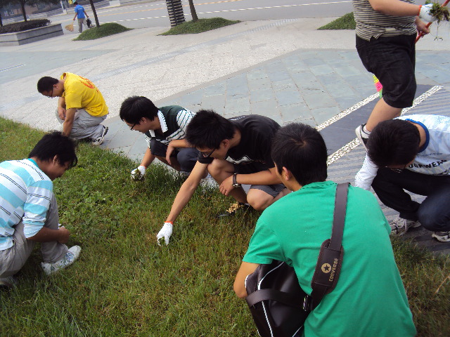 尽管负责的区域有点大,阳光照射也逐渐强烈,但是,丝毫不影响大家奋力除草。大家行动一致,一批人一起在草地中来回忙碌,时不时研究下这不是杂草,该不该除去,偶尔说笑一下,劲头十足。除了杂草,连草地上的一些垃圾物,大家也一并收拾干净。垃圾袋渐渐变得庞大而沉重,大家看着觉得很满足,但没有停下忙碌的双手,拔下杂草后直接扔进了附近的垃圾桶。