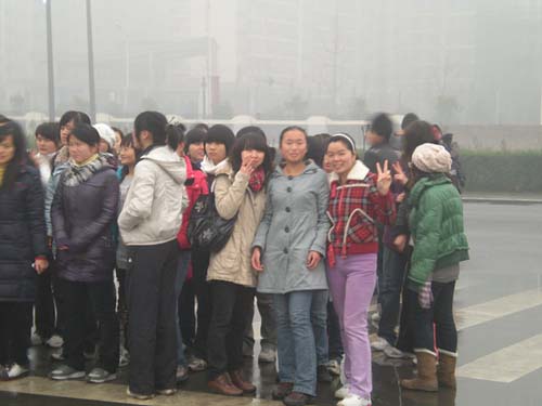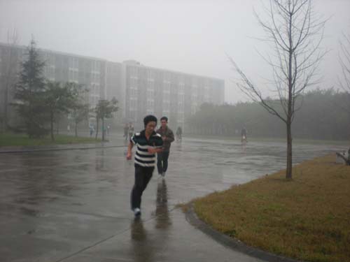 虽然天气很冷,还下着毛毛雨,可是这阻挡不了同学们长跑的热情。体力好的同学紧跟着带队老师的车,跑在前面,后面的同学也没有放弃,坚持跑向了终点。同学们你追我赶,相互鼓励。两个人一起跑比一个人好得多,社会促进理论再次彰显。