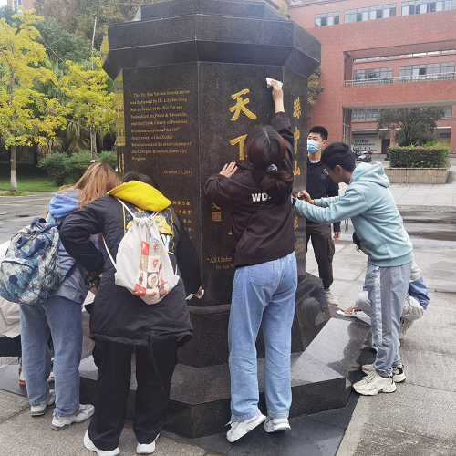 深秋的早晨,心理青协的志愿者们带着齐全的清洁工具来到了雕塑前。光滑的大理石雕像上沾着雾气与尘土,志愿者们分工协作,先用清水洗去雕塑表面的灰尘,再用纸巾细细擦拭干净。有些污渍难以去除。志愿者们就用毛巾耐心地磨洗,直到雕塑光洁一新。清洁过程花费了一个多小时,志愿者们不觉繁琐不觉疲倦,尽全力将雕塑清洁干净。活动的最后,所有志愿者怀着崇高的敬意站在雕塑前与前辈合照留恋,体会着劳动与奉献带来的快乐。