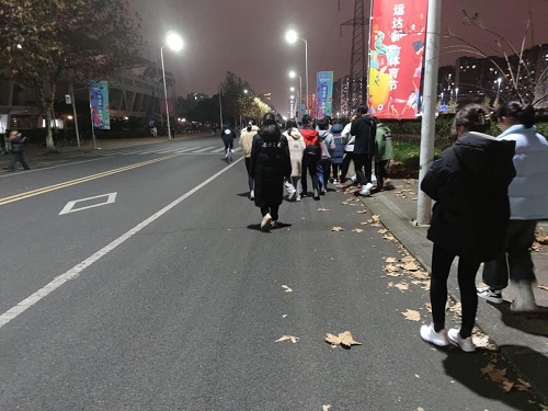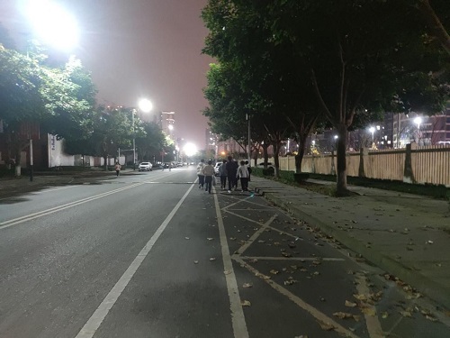 在此次活动中,同学们围绕着学校最外层的路线进行夜跑活动,目标路程三公里。起初,同学们步伐坚定有力,在接近任务完成时,很多同学明显体力不支,但依然疲惫地前行。