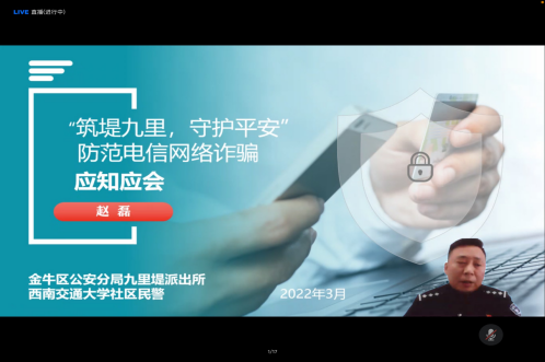 为落实校园防范电信网络诈骗工作,切实提升师生的安全防范意识,保障师生生命财产安全,2022年4月8日下午三点,吃瓜黑料 联同马克思主义学院特意邀请九里堤派出所、西南交大社区民警赵磊为师生讲解“防范电信网络诈骗”专题讲座。此次讲座以线上方式进行,中心本研全体学生参与。