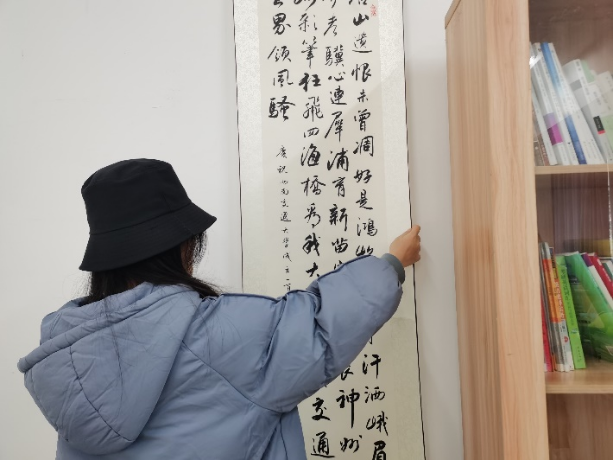 学生会还为自习室准备了字画,参与活动的同学将字画挂在自习室的墙上,营造自习室的书香氛围。从古至今,字画都被名人雅士所喜好和推崇,而书画不仅可以登大雅之堂,也能走进“自习之室”。