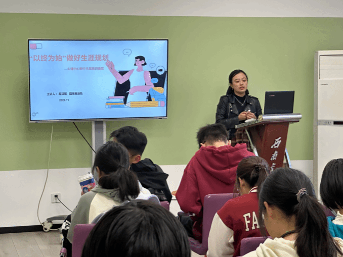 易老师将讲座的内容分为三个板块,分别是“职业生涯规划是什么”、“更好地认识自我”、“行动指南”。在讲座过程中,易老师从同学们的专业本身出发,解答了同学们有关考研现状、就业前景、社会就业形势等问题。作为一名资深的导师,易老师表示:“无数的经验与实例告诉我们大学生职业生涯规划要越早越好,同学们要学会从互联网中获取有意义、多样化的信息,树立明确的目标。”在讲座的最后,易老师向同学们介绍了“西南交大就业”公众号,提倡同学们利用学校资源,拓展自己的认知范围。