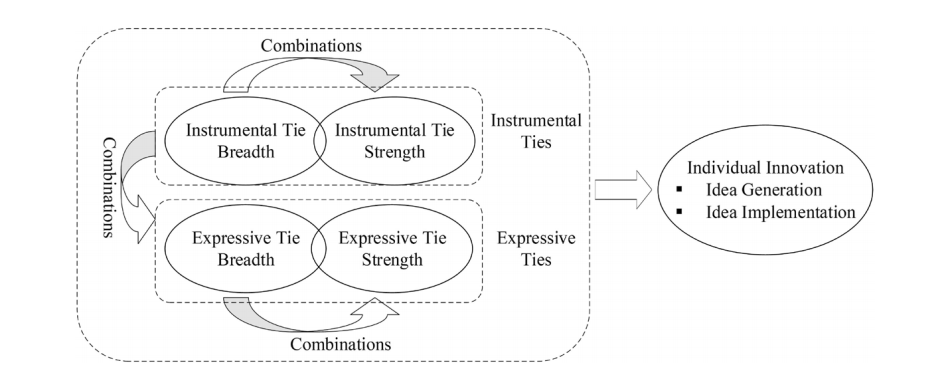 在快速变化的商业环境中,组织需要依靠创新以满足客户需求、跟进技术发展。员工作为组织创新的重要来源,如何促进员工个体创新是企业和学者共同关注的热点话题。个体创新是指个体产生创新构想,并努力将之付诸实践的行为。由于创新的社会嵌入性,从社会网络的角度促进个体创新已成为创新研究的一个重要领域。然而,个体创新是一个动态的过程:包含从创新想法产生到创新想法实施两个阶段,且这两个创新阶段存在不同的资源需求。既有研究多从静态视角探讨单一社会网络结构对个体创新的影响,缺乏从动态视角考察不同社会网络结构对个体创新的不同阶段的影响变化。尽管最近研究表明个体成功创新与创新者在不同阶段激活不同网络关系有关,但对不同社会网络特征组合的影响认识有限。为此,本研究基于结构—关系研究框架,关注工具性和情感性两种连带类型及广度和强度两种连带特征,探究不同网络连带特征组合如何影响个体创新想法的产生与实施。