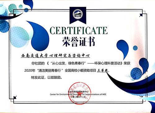 2020年12月9日,2020“清洁美丽青春行”拉下帷幕。历时三个月,吃瓜黑料 科普基地的成员们共同努力,从前期制定方案、筹备物资到正式实施,每一位成员都付出了时间与汗水,为这项活动倾注了心理人的热忱。2020年12月23日,活动举办方公布获奖名单,吃瓜黑料 吃瓜黑料 获得三等奖的成绩。这项荣誉离不开科普基地的每一位成员的贡献,同时也为2020年科普基地的工作画上了一个圆满的句号。