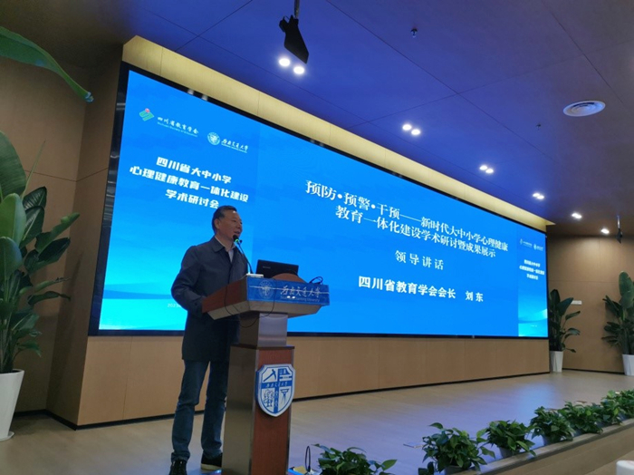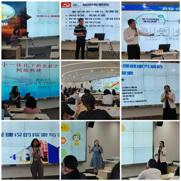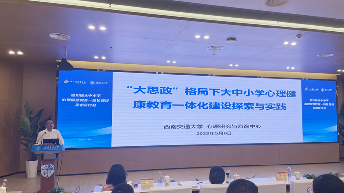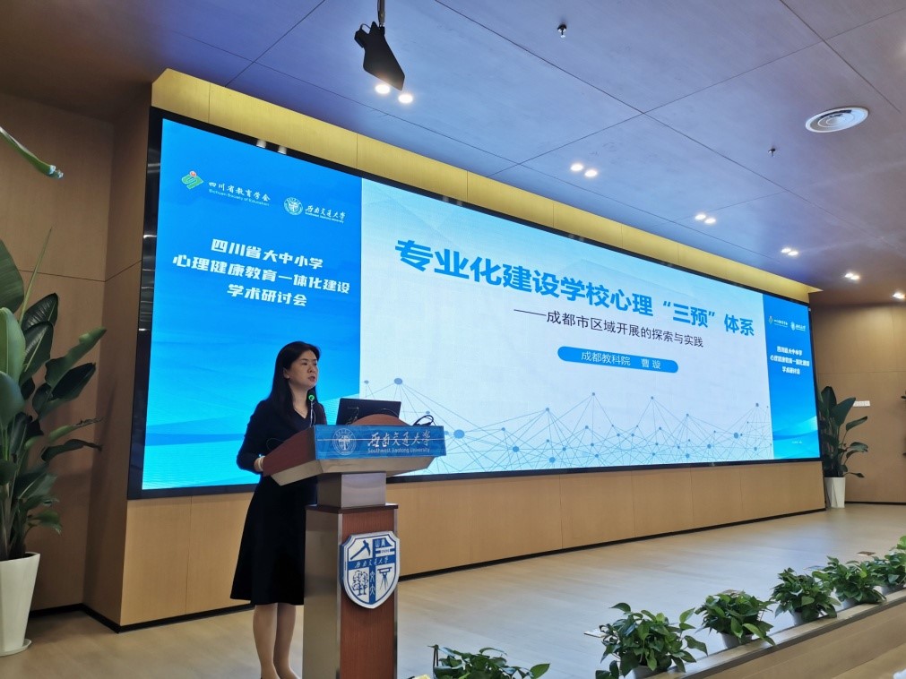 副主任雷鸣作了《“大思政”格局下大中小学心理健康教育一体化建设探索与实践》主旨报告,从心理健康教育与思想政治工作的关系、大学不同阶段的衔接与过渡、面向中小学提供心理健康工作指导、推进家—校—社(医)协同联动等方面,分享了西南交大开展大中小学心理健康教育一体化的建设经验,呼吁建立全省大中小学心理健康教育一体化建设共同体。四川省教育学会德育与心理健康教育分会副理事长、成都市教科院心理艺体研究所所长曹璇作了《专业化建设学校心理“三预”体系——以成都市为例》主旨报告,从“整体思考,系统工作;主动防预,夯实基础;分级预警,防微杜渐;科学干预,协同克难”四个方面,分享了成都市中小学开展心理危机预防、预警、干预的做法和经验。