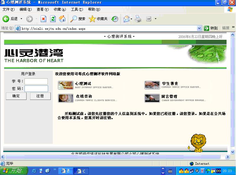 “心力网”在前期建设过程中,部分学生在“专业测评”栏目进行测评后无法得到及时反馈。目前该版块功能已经升级,为了服务于我校师生,我们将提供一个月的义务测评。请大家先注册再登陆进行测评后,到注册时所填邮箱察看结果反馈。在此,我们诚挚地感谢各位的热情参与,并期待“心力网”在各位朋友的关心与支持下,逐渐成长与完善。