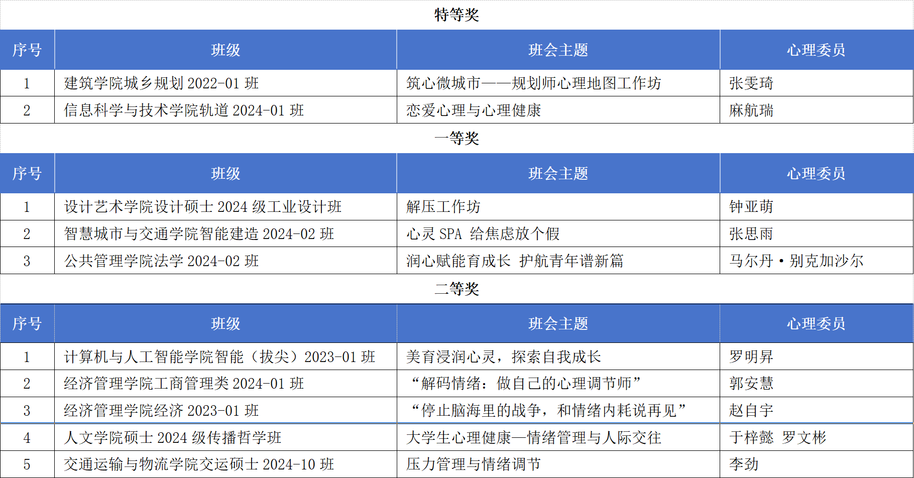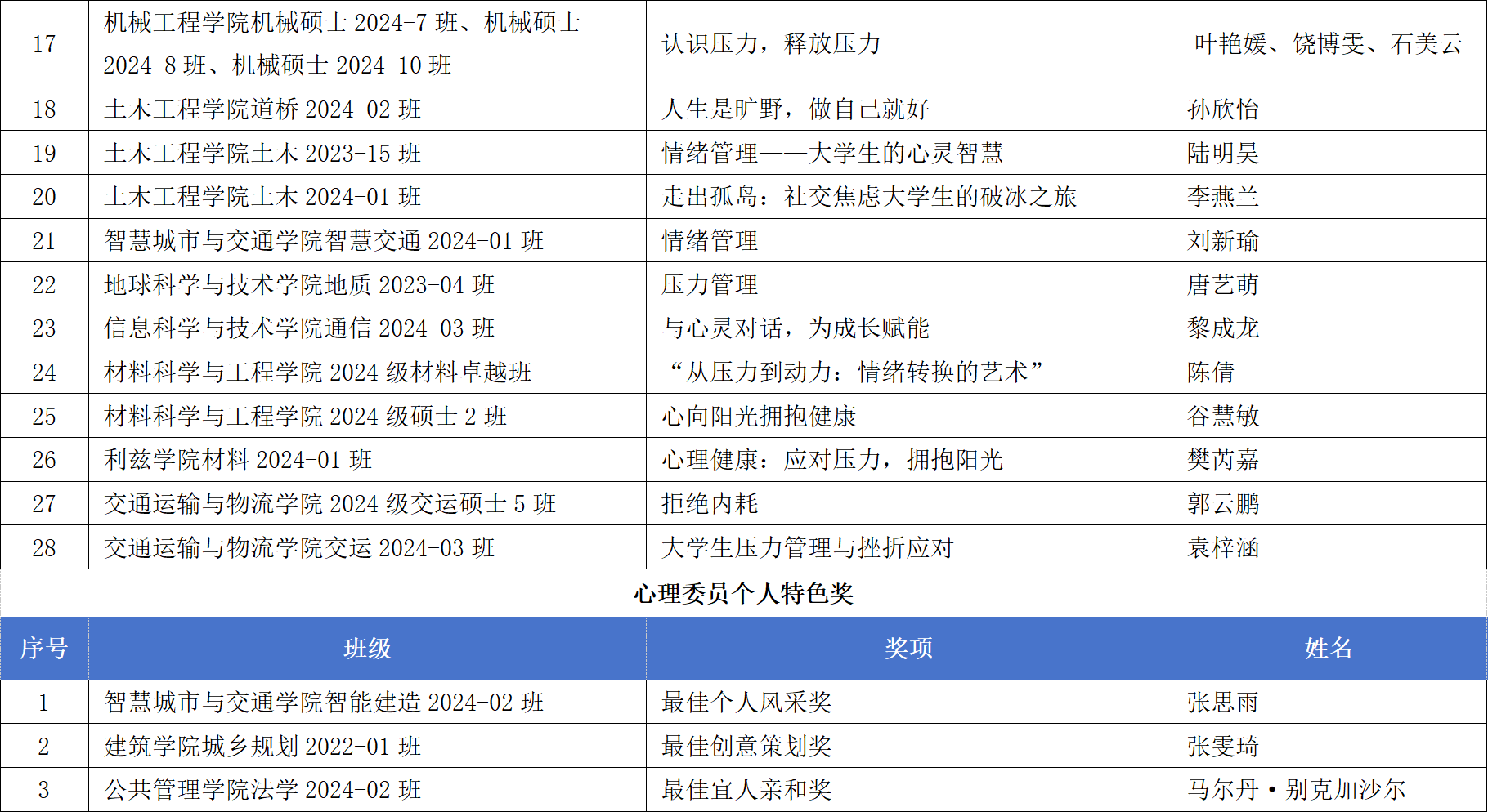 2025年度学校“交心桥”心理班会展示会经学院初赛推荐、展示会复赛、决赛,评选出特等奖2项、一等奖3项、二等奖5项、三等奖20项、优秀奖28项以及心理委员个人特色奖3项。现将获奖名单公布如下: