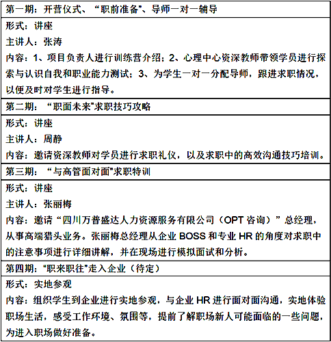现针对毕业年级中求职能力欠缺的学生群体,同时也面向想要更加认识自己和提升自己求职能力的学生群体,特开展“求职训练营”,以求让更多同学掌握求职的方法和技巧。通过讨论式、参与式、导师一对一辅导式的教学方法,让学生真正在体验中感悟,训练中成长,逐渐提高对自我的认识能力和求职能力。