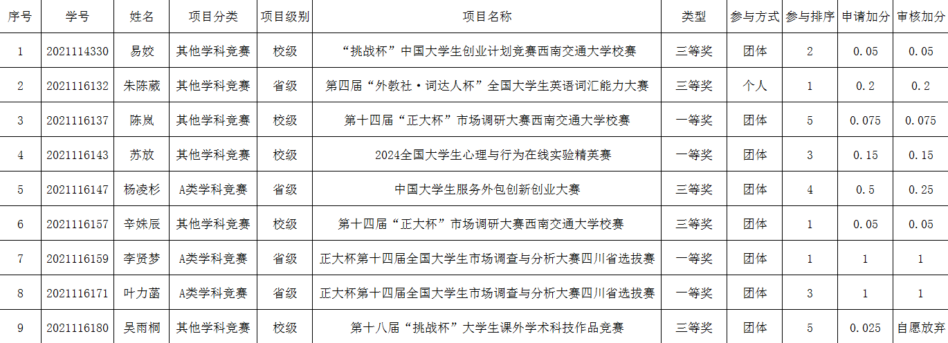 【推免】关于2025届应用心理学专业申请推免资格特殊学术专长加分项审核结果及加分情况的公示