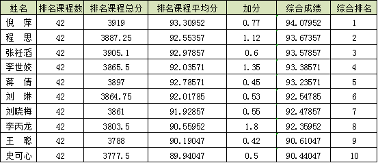 关于开展推荐2021届优秀应届本科毕业生免试攻读研究生工作的通知》,倪萍等10位同学申请2021届优秀应届本科毕业生免试攻读研究生资格,并对排名课程成绩、加分情况进行签字确认,经中心推免生遴选工作小组审定,现将这10位申请推免生资格的学生的推免课程成绩、加分、综合成绩以及综合排名进行公示,具体内容见下表。