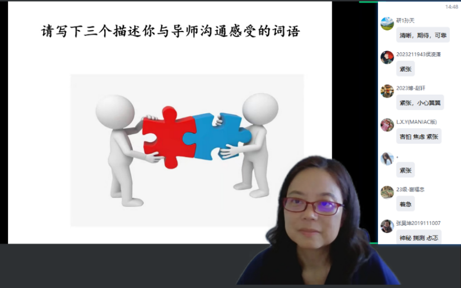 田老师首先分享了一段经历,引出主题,强调了与导师沟通的重要性。随后,田老师发起了一个小调查,让同学们用三个词语描述自己与导师沟通感受。在同学们写出的词语中,“紧张”出现次数最多,也有同学写出了“温柔、有条理、耐心负责”等词语,田老师就调查结果了解了同学们与导师关系的普遍情况,分析了同学们目前与导师关系的问题。