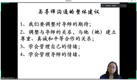最后,田老师还给大家总结了与导师沟通的整体意见:1、我们要调整对导师的期待,并协助导师调整对自己的期待,使彼此的期待相匹配;2、调整与导师的关系,与他(她)建立尊重、真诚和平等合作的关系;3、学会管理自己的情绪;4、学会管理导师的情绪。