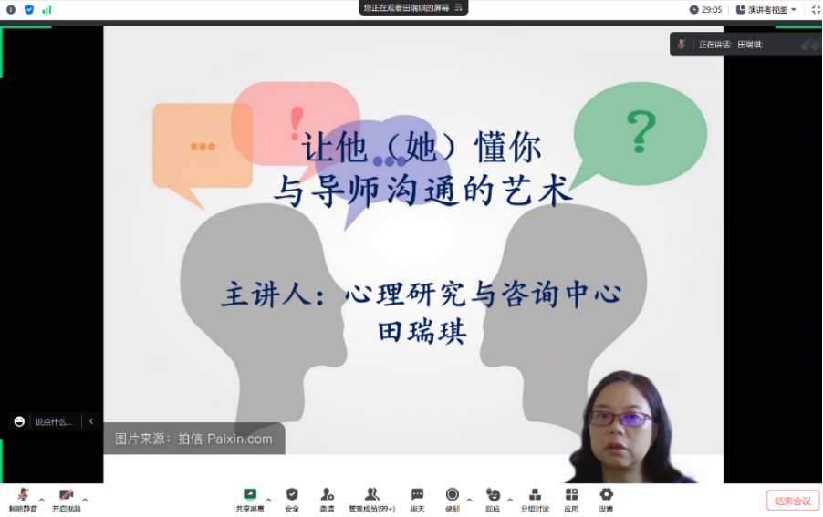 的田瑞琪老师,讲座主题是“让他(她)懂你——与导师沟通的艺术”,内容囊括我与导师的关系、导师类型分析以及与导师相处的建议等,由此帮助大家增进浓浓师生情。本次讲座共有120余人参与。