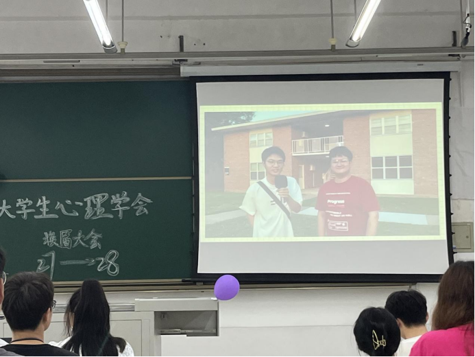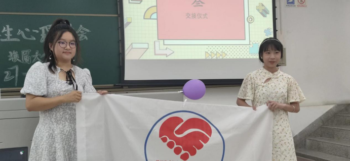 接下来是交接仪式和欢送留念环节。在交接仪式部分,在主持人的引导下,27届团支书徐睿将会旗交到28届会长李贤梦手中,象征着心理学会的换届,也代表着前任干部对新任干部的信赖。