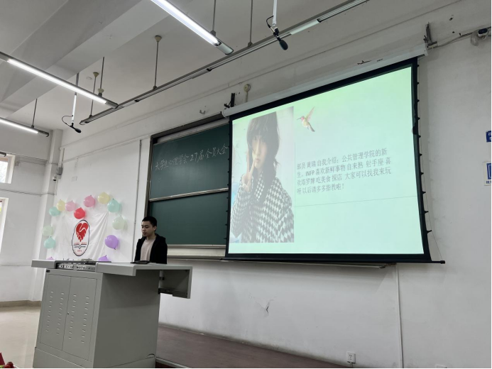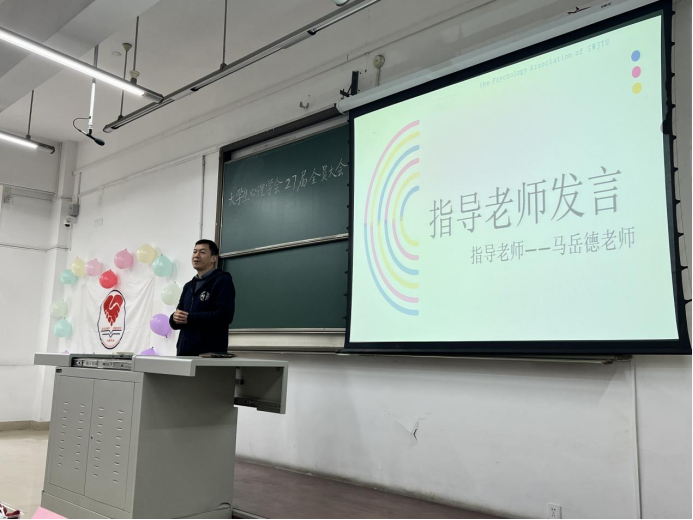 大会第二项,心理学会指导老师马岳德老师进行发言,马老师指出,心理学会走过20余年的风风雨雨,社团做出许多成绩,前辈们留下不少回忆,至今每每看来都令人感慨良多。马老师祝愿新一届心理学会成员能够延续前辈们的足迹,带领心学大家庭不断奋进,再创辉煌。