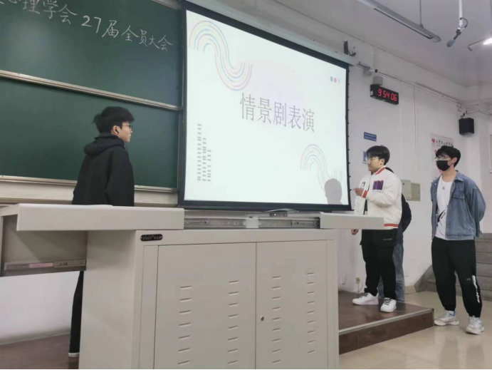 大会第一项,为同学们播放由心理学会情景剧团拍摄的宣传片《群岛》,让大家明白了在社会上没有人是一座孤岛,使同学们内心对心理学会有了更深的羁绊。随后,由情景剧团的各位演员给大家带来了精彩的情景剧表演,现场气氛越发高涨。