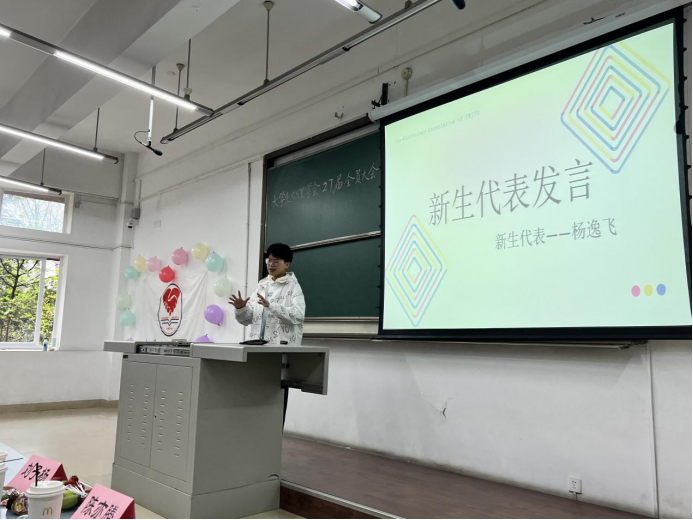紧接着,新生代表杨逸飞上台发言,他讲述了自己与心理学多年前的邂逅和羁绊,最终如何来到了心学这个大家庭,这也代表了很多新生的内心,大家都十分感同身受。
