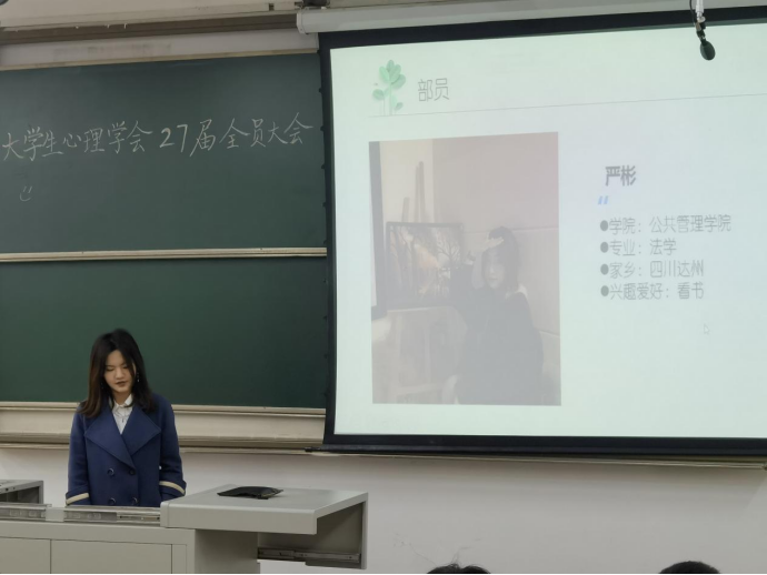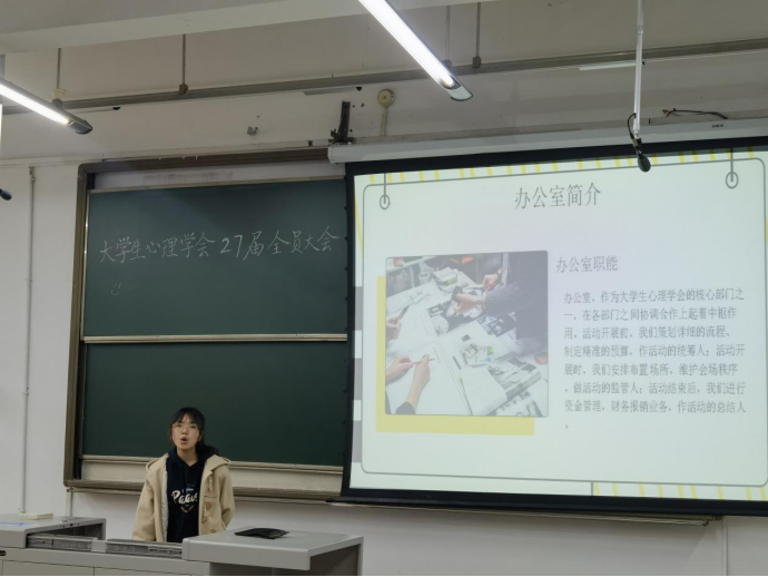 大会第四项。由各部门部长进行部门的简要介绍以及部员介绍。首先是大学生心理学会办公室,活动开展前,策划详细的流程、制定精准的预算,作活动的统筹人;活动开展时,安排布置场所,维护会场秩序,做活动的监管人;活动结束后,进行资金管理,财务报销业务,作活动的总结人。部长连岩鹏,副部长李泓进,副部长李迪。