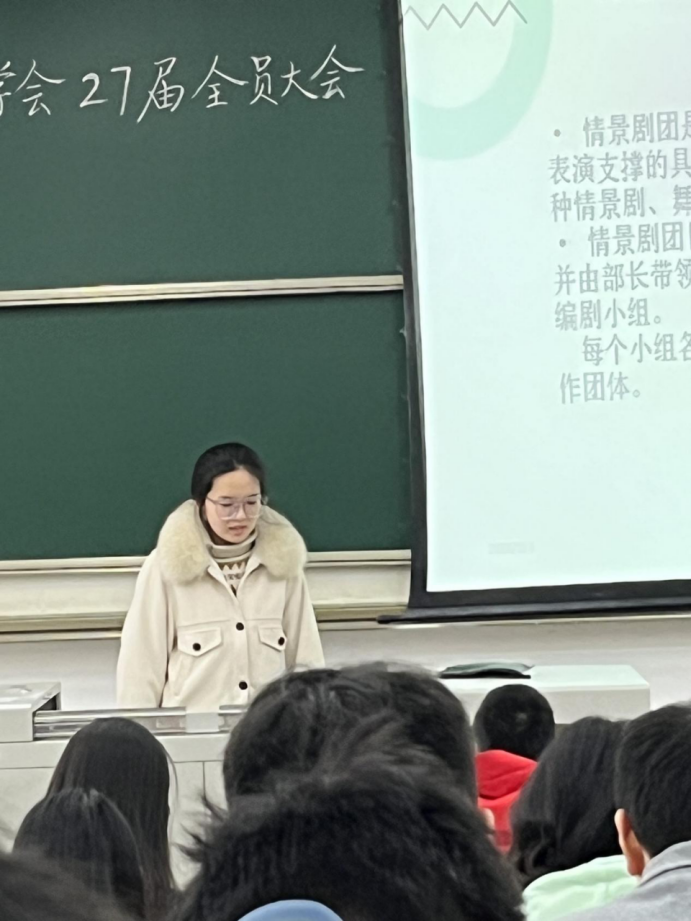 全员大会开始前,主持人先为我们介绍了本次全员大会到场的嘉宾:心理学会指导老师马岳德老师、青年志愿者联合会志愿者管理部副理事陈亦腾同学、茅以升学院心力社会长李宛桐同学、学生社团管理服务中心活动部副理事刘子杨同学、学生社团管理服务中心考核部副部长黄楚涵同学、科幻协会团支书刘晏兵同学、退伍军人协会会长白云锐同学、大学生创新创业俱乐部会长宋锐奇同学、大学生创新创业俱乐部学术部部长陈潇盈同学、大学生心理学会二十六届副会长李政同学、大学生心理学会二十六届副会长张桂翔同学、大学生心理学会二十六届副会长林智杰同学。
