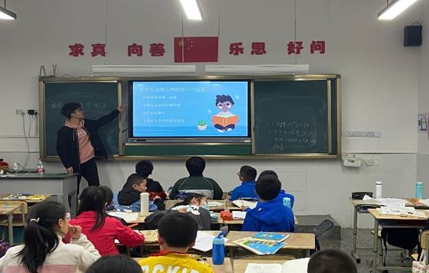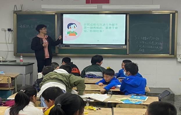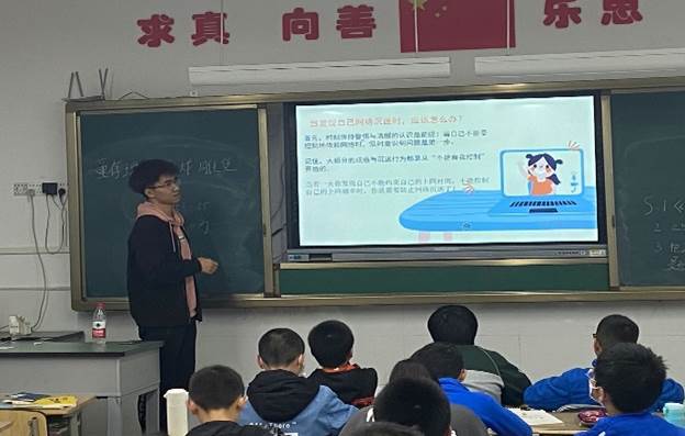 随后小老师向同学们介绍上网时“忘我”的现象,并让大家思考自己在日常生活中是否有这种现象,并解释产生这种现象的原因。听到这里,有一些同学点起了头,表示自己上网时经常会感觉时间过得很快。看到这里,小老师便趁机向同学们科普网络成瘾的相关知识,强调网络成瘾的危害,同学们似懂非懂的点了点头,有了一些思考。